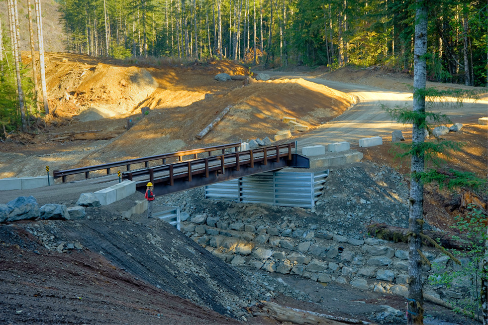 Culverts, erosion controls, and sediment barriers are installed, followed by stump grinding, topsoil respread, and final cleanup for project turnover.